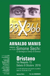 Ottobre denso e intenso quello della rassegna d’arte e cultura 33 x 366, ispirata a Gramsci e voluta e realizzata, in collaborazione con una estesa rete di artisti sardi, dalla Biblioteca Gramsciana Onlus. Arnaldo Manis, grande erede della tradizione dei figoli di Oristano, aprirà dalle 16 alle 21, sabato 8 ottobre, il proprio laboratorio in via Neapolis 15 a Oristano. La riflessione sui temi gramsciani è affidata a Simone Sechi alle 18.30 con La Sardegna ai tempi di Gramsci. Qualche cenno ai protagonisti di questo quindicesimo appuntamento. Arnaldo Manias è figlio di un ceramista, che dopo il diploma all’Istituto d’Arte di Oristano costituisce la Coop. C.M.A. Ceramica Maestri d’Arte. Per 6 anni lavora nella CMA, poi con suo padre e il fratello nella Ceramiche Manis per 10 anni. Nel 1996 è di ruolo nell’insegnamento dell’arte della ceramica, all’Istituto d’Arte di Oristano (ora Liceo Artistico) dove insegna tutt’ora. Simone Sechi, già docente di storia e filosofia nei licei e dirigente scolastico, direttore della sede di Sassari e vicepresidente regionale dell’Istituto sardo per la Storia della Resistenza e dell’Autonomia, ha insegnato Storia della Sardegna contemporanea nell’Università di Sassari ed è autore di numerosi saggi sulla Sardegna nel Novecento. Il secondo appuntamento di ottobre e il sedicesimo di 33 x 366 è per sabato 15 al Museo del Mare di Marcedì, dove Marco Sessuru proporrà oltre a una scelta delle sue opere anche una performance ispirata alle riflessioni gramsciane. Alle 18.30 Franciscu Sedda, docente di Semiotica presso l’Università degli Studi di Roma “Tor Vergata”, benemerito dell’articolato arcipelago indipendentista, ci intratterrà con Gramsci, l’indipendenza, l’identificazione. http://liberos.it/eventi/33-x-366-arnaldo-manis-ad-oristano-ospita gramsci/1800 e https://www.facebook.com/events/788165037952969/ Luigi Manias