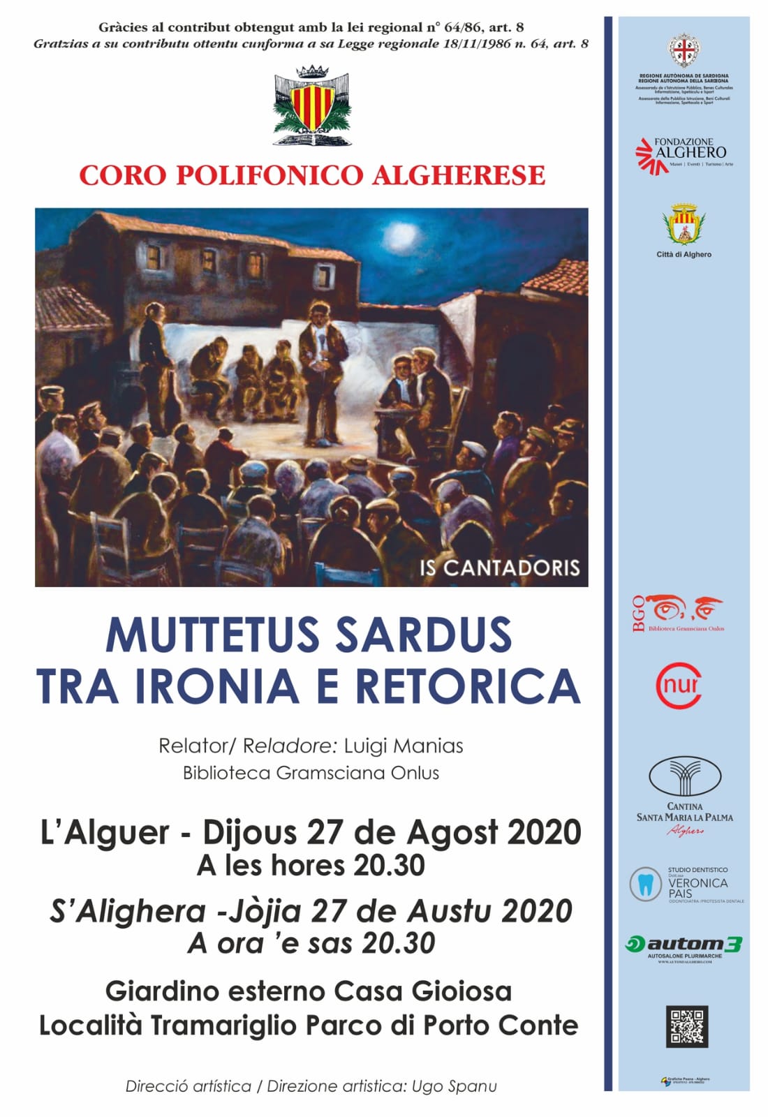 Nara, femina bona: / custa e’ Lunamatrona?/Nara femina giusta: / Lunamatrona è custa?// E’ l’incipit di una intensa, quanto informale, gara poetica che in un imprecisato giorno dell’800 vede protagonisti due noti poeti improvvisatori (Antiogu Bray e Chiccheddu Salis) e la celeberrima Potenzia Cappai, che di rimando: Poita mi domandais / Punt’ a coru siais / Cust’e’ sa bidda mia / Punt’a coru’ si bia.// Paolo Zedda, nella partecipata introduzione alla nuova edizione dei Mille mutetus cagliaritani raccolti da Raffa Garzia (Arkadia, Cagliari, 2017), ricorda che i mutetus sono prima di tutto suoni e non segni grafici. Nella Sardegna di un secolo fa quasi tutti i sardi erano poeti – cantanti e il mutetu era la forma strofica improvvisata dominante, non solo nel sud della Sardegna, ma nell’intera Isola. Era la forma più colorita e visionaria della produzione poetica sarda, espressione verace del sentire popolare e non di un’esangue élite di intellettuali. Ma era anche, nel mutetu a duus peis, un banco di prova autentico per dimostrare le propria capacità di sintesi in soli quattro versi. Il patrimonio testuale di questa breve forma poetica cantata era condiviso da un’intera comunità e veniva trasmesso da un cantatore all’altro. Poesia cantata ancora praticata, il mutetu sta raccogliendo sempre più nuovi ed entusiasti estimatori. Biblioteca Gramsciana Onlus e Nur su invito del Coro Polifonico Algherese, hanno organizzato con lo scrivente un’incontro di approfondimento ad Alghero – giovedì 27 agosto alle 20.30, nella splendida cornice del giardino esterno di Casa Gioiosa, a Tramariglio nel Parco di Porte Conte – dove sarà proposta un’ampia disamina dei temi più classici del mutetu: amore, satira e burla, oscenità. Il tutto corroborato da un concerto del Coro Polifonico Algherese diretto dal Maestro Ugo Spanu. Luigi Manias