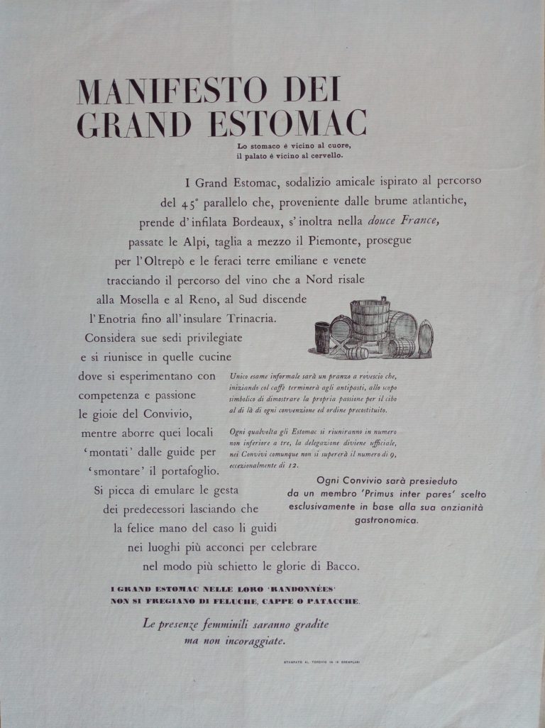 Così recita: “Lo stomaco è vicino al cuore, il palato è vicino al cervello. I Grand Estomac, sodalizio amicale ispirato al percorso del 45° parallelo che, proveniente dalle brume atlantiche, prende d’infilata Bordeaux, s’inoltra nella douce France, passate le Alpi,…