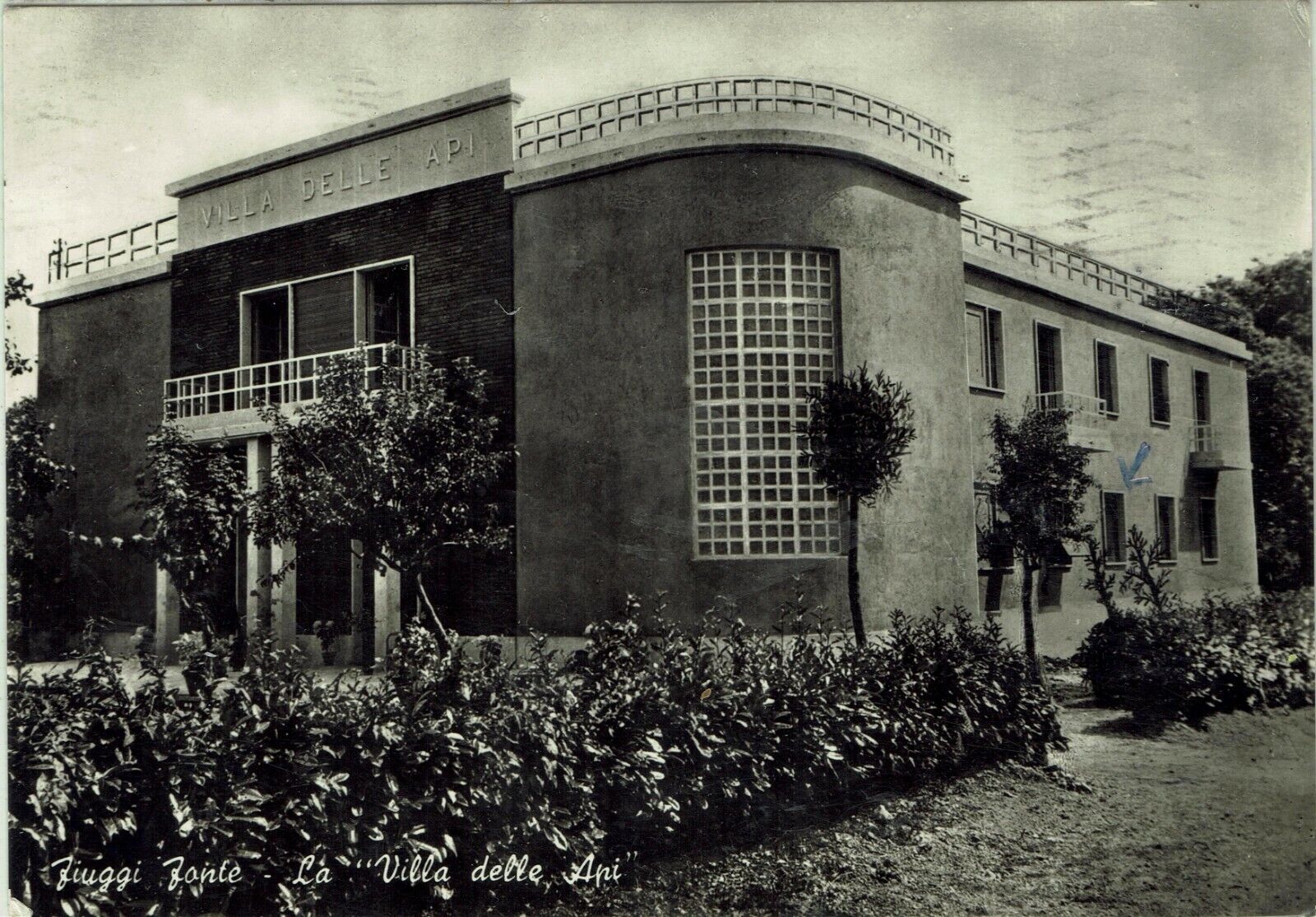 Nel rapporto millenario con le api la creatività degli uomini ha prodotto opere di sicura originalità e valore, alle quali sono corrisposte altrettante cadute di gusto. Compie oggi 60 anni, ma con timbro postale di partenza 22 giugno, una cartolina illustrata inviata da una non meglio precisata Francesca a Gaeta Vittoria di Firenze, raffigurante la Villa della Api a Fiuggi. Un occhio attento noterà sull’architrave di una finestra al piano terra dell’immobile una freccia, presumibilmente indicante la stanza dove la mittente ha alloggiato. Edificio non residenziale ma struttura alberghiera classificata come pensione di prima categoria, gestita nel 1951 dall’avvocato Domenico Cellucci, nel 1959 da Michelina Ambrosi e, secondo la guida del Lazio del TCI del 1964, comprensiva di 18 camere e 8 bagni con acqua corrente fredda. Realizzata nel 1937 su progetto del geometra Rolando Verghetti (Roma, 27.04.1909, diplomato nel 1928 all’Istituto Tecnico di Caserta), in origine si chiamava “Pensione Novecento”. Ma Cellucci, che aveva impiantato un consistente apiario nel giardino retrostante, modificò la titolazione. Ispirata nell’impianto d’origine ai canoni dell’architettura razionalista ma, come pertinentemente osserva il prof. Carlo Atzeni, declinata nell’accezione italica; dove “la dimensione ancora artigianale del cantiere e la massività muraria continuano ancora a prevalere pur accogliendo l’innovazione formale e strutturale del razionalismo europeo”. Seppure successivamente stravolta negli elementi decorativi connotanti, nella cartolina riportata in testa all’articolo, spedita nel giugno 1964 ed edita dalla Fotocelere di Torino di Angelo Campassi (attiva tra il 1930 e il 1960 ca.), l’immagine della Villa delle Api sembrerebbe essere quella dell’immobile degli esordi. Il motivo del reticolo alveolare del favo è reiterato oltre che nel finestrone centrale della torre contigua all’entrata – caratterizzata dal colonnato in travertino bianco sormontata da un balcone e nella cui modanatura marmorea liscia superiore campeggia la scritta Villa delle Api – anche nelle balaustre del terrazzo e dei balconi. Ebbene chi voglia rivedere le sobrie linee dell’edificio e quel motivo così evocativo che aveva titolato la struttura stenterà a fatica, nelle immagini di oggi, a riconoscerla. Luigi Manias