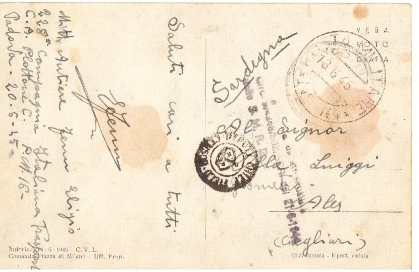 La cartolina spedita in Sardegna dall’autiere Eligio Fenu – di stanza a Padova presso la 228 Compagnia Italiana Trasporti, C.A. Plotone C – al Signor Luigi Olla, geometra in Ales (Cagliari), sembra rispondere nei contenuti ai canoni degli scambi epistolari: “Saluti cari a tutti”. Boricu Fenu e Pillimedda Floris, padre e madre di Eligio Albino Fenu, nato ad Ales il 24 settembre 1923, erano in ottimi rapporti di amicizia con Luigi Olla e sua moglie Maria Efisia Manias. Ricorda Verina Olla, figlia di Luigi, che sua madre Efisia Manias le raccontava che andò a visitare Pillimedda Floris al momento della nascita di Eligio. Visita ricambiata qualche giorno dopo da Pillimedda alla nascita proprio di Verina. Il retro del documento, per gli elementi presenti, ne fa un interessante reperto postale; segnatamente nell’ambito specialistico della storia della posta militare. Il bollo postale di partenza è un timbro di Posta Militare. La corrispondenza trasportata con il canale militare si distingueva da quella civile per la presenza di bolli tipici. Le forze di terra usavano quasi sempre la dicitura “Posta Militare”. Le scritte non contenevano nomi di località ma un numero identificativo, oppure il nome dell’unità da cui dipendevano. Le unità o le divisioni militari alla loro costituzione erano dotate di ufficio postale, che si spostava al seguito dei reparti, con propri bolli a data variabile di posta militare, identificate dal numero o dal nome del reparto. Nel nostro caso il bollo Posta Militare 16 fu assegnato alla 58^ Divisione di fanteria “Legnano”, che dal 15.9.1944 dipenderà dal Comando 228^ Divisione I.F.A. – H.Q., a sua volta alle dipendenze dell’8^ Armata inglese. L’ufficio postale è dislocato dal 15.5.1945 a Padova, da dove Eligio Fenu invierà la cartolina a Luigi Olla. Altro elemento d’interesse è il bollo “Deputy Chief Field – Censor”, ovvero il passaggio all’ufficio di censura dell’8^ Armata inglese. Luigi Manias